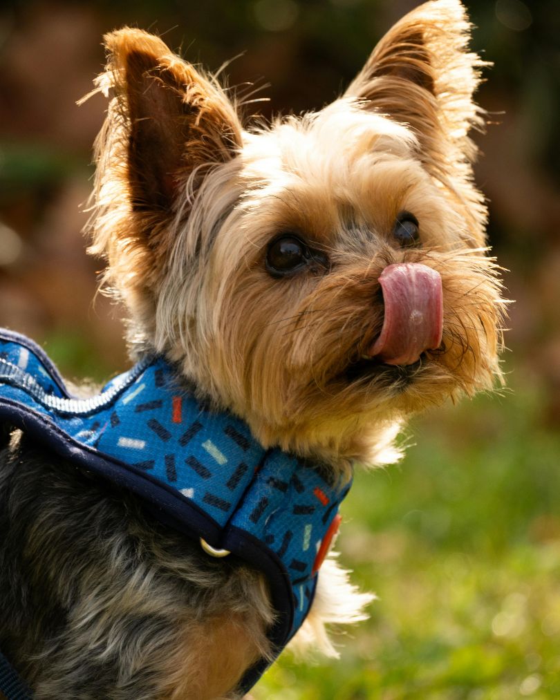 O Yorkshire Terrier possui pelo longo, sedoso e fino, semelhante a cabelo humano, exigindo tosa a cada 4-5 semanas. Os estilos mais populares são a tosa filhote (corpo curto com pernas e orelhas longas) e a tosa de exposição (pelos longos até o chão). Use máquina com pente #5 ou #7 no corpo e tesoura para acabamentos precisos. O banho e tosa do York custa entre R$ 70 e R$ 130.